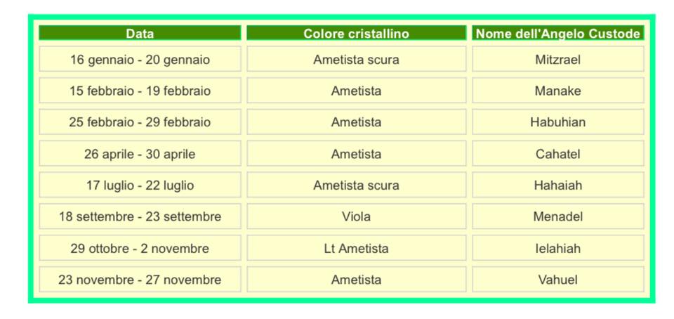 La bella luce viola dell'ametista è particolarmente favorevole alla comunione con gli angeli. È di colore dal rosso pallido-violetto (colore ametista) al viola intenso. Se il tuo compleanno cade in uno dei seguenti periodi, un'Ametista del colore elencato può essere un prezioso condotto per il tuo Angelo Custode.