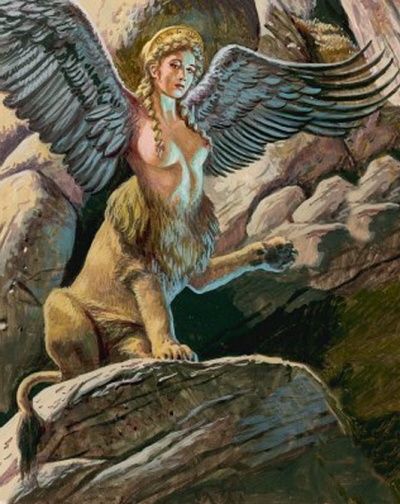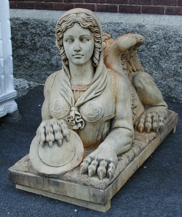Σφίγξ, figlia di Echidna e di Tifone o del cane Ortro, che aveva il volto di donna, il petto, le zampe e la coda di leone, e le ali di uccello. Le Muse le avevano insegnato un enigma e, stando seduta sul monte Ficio, poneva questo enigma ai Tebani. Esso recitava: "Qual è quella cosa che ha una sola voce, e ha quattro gambe e due gambe e tre gambe?". I Tebani avevano ricevuto un oracolo, secondo il quale si sarebbero liberati della Sfinge solo quando avessero risolto il suo enigma; per questo spesso si riunivano a discuterne il significato, ma siccome non ci riuscivano, la Sfinge ogni volta prendeva uno di loro e se lo mangiava. Edipo ascoltò l'enigma della Sfinge e riuscì a risolverlo: la soluzione era l'uomo". Infatti da bambino ha quattro piedi, perché cammina a quattro zampe; da adulto due piedi; e da vecchio tre, perché si appoggia al bastone. La Sfinge allora si gettò giù dalla rocca e morì.